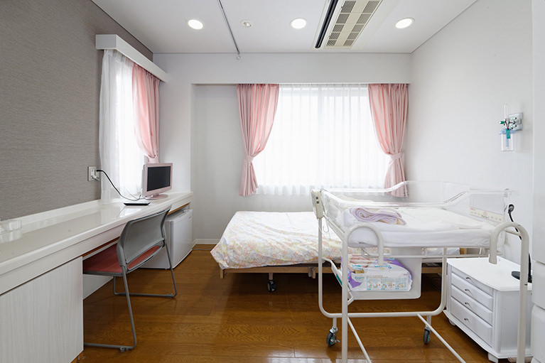 不安の多い出産前後の時期を、少しでもリラックスして自宅のように過ごしてもらえるよう、院内には冷蔵庫やテレビなどの設備が整った個室を用意しています。